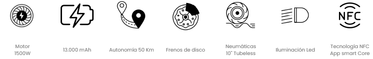 Patinete eléctrico certificado con una potencia máxima de 1500W 48V, batería de litio de 13.000 mAh con hasta 50 km de autonomía, ruedas de 10" neumáticas tubeless, Doble suspensión delantera y trasera por elastómeros, triple frenada, intermitentes y APP compatible Smart Core.